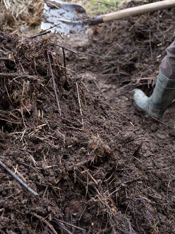 Nos divers tas de compost constituent une partie intégrante de notre jardin de plantes médicinales. Le compost crée la structure durable permettant au sol et aux plantes de s’épanouir harmonieusement. Cependant, tout compost n'est pas égal, par exemple en ce qui concerne le compost de feuilles et de fumier, chaque tas est retourné quatre fois à la main jusqu’à maturité. C'est ainsi que nous constatons directement la qualité qui se développe. Après le retournement, nos jardinières et jardiniers ajoutent diverses préparations biodynamiques au compost. Orties, Camomille, Achillée, écorce de Chêne et Pissenlit aident le compost à murir. Pour finir, une épaisse couche de paille est ajoutée à chaque tas de compost comme une peau protectrice.