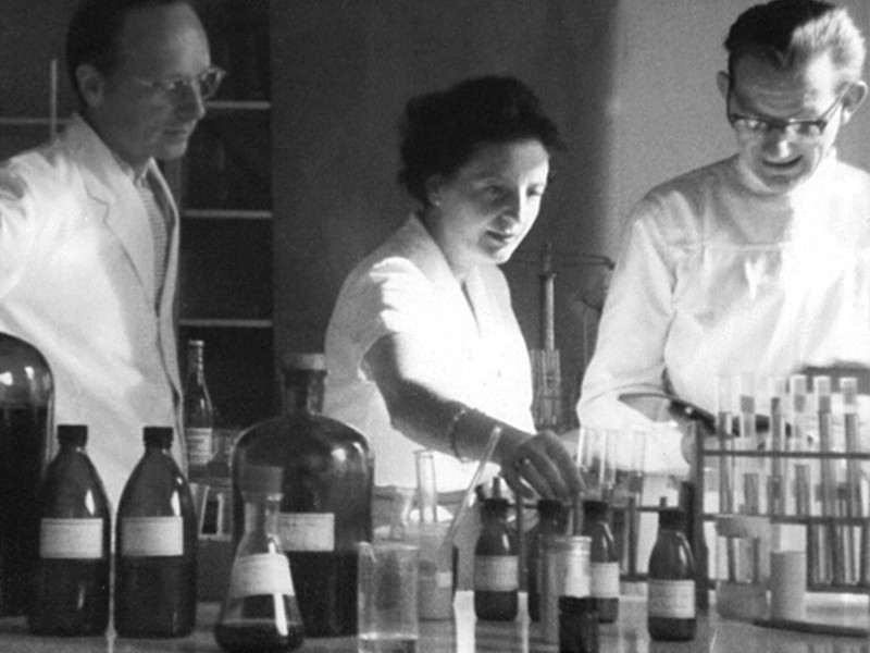 De apotheker Rudolf Plantener, Elisabeth Sigmund en de scheikundige dr. Reinhard Schoppmann (van links naar rechts) vormden in 1964 de eerste ontwikkelingsgroep voor de nieuwe 'WALA cosmetica'.